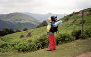 Nous faisons demi-tour puis repartons dans une autre direction, balisée cette fois. Nous descendons le long d'une crête, puis plongeons dans une vallée où, après avoir traversé des champs de fougères mouillées, nous retrouvons une route goudronnée. Nous sommes à 3 km du col où nous aurions dû arriver directement. Une heure de remontée sous la pluie et par la route, en territoire français, afin de retrouver le bon itinéraire. Encore une erreur de parcours. Et de deux !