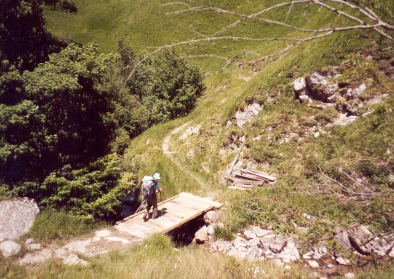 | Une sente difficile à trouver conduit ensuite au pont en bois de Chubigna (746 m ), en amont de l'endroit où la rivière Nive prend sa source.