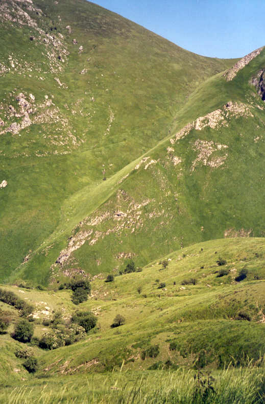 En descendant la face Est du col d'Errozaté vers les bergeries d'Uhartegain, la longue crête d'Urculu qui se profile devant nous, laisse penser à la rude journée du lendemain.