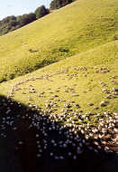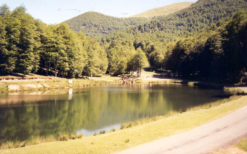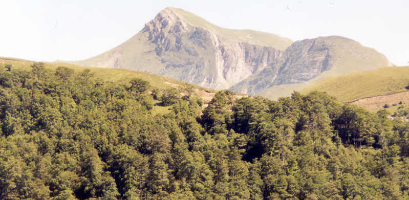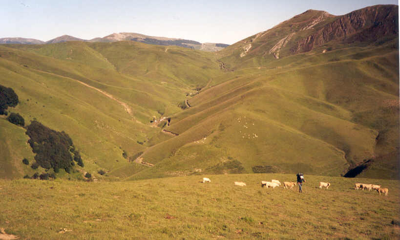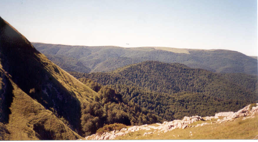 En passant près du col Curutche (1285 m), Philippe a envie d'aller voir ce qu'il y a sur le versant sud : des pentes herbeuses disparaissant dans les épaisses futaies de hêtres. Jusqu'aux crêtes lointaines la forêt épouse les courbes des plissements montagneux, les couvrant d'un vert sombre...