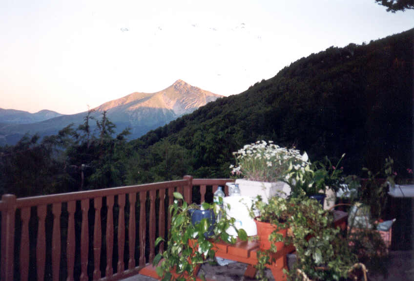 | À la nuit tombante, nous redescendons au centre chercher le téléphone. Quand nous quittons la terrasse du bar, les derniers rayons du soleil éclairent encore le pic d'Orhy, notre destination du lendemain.