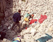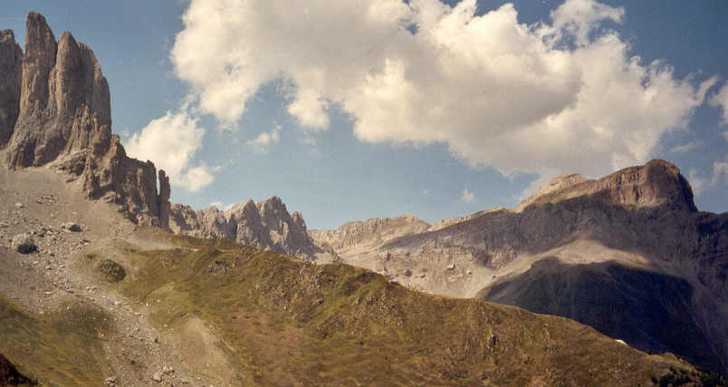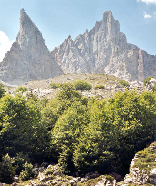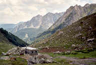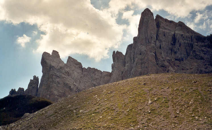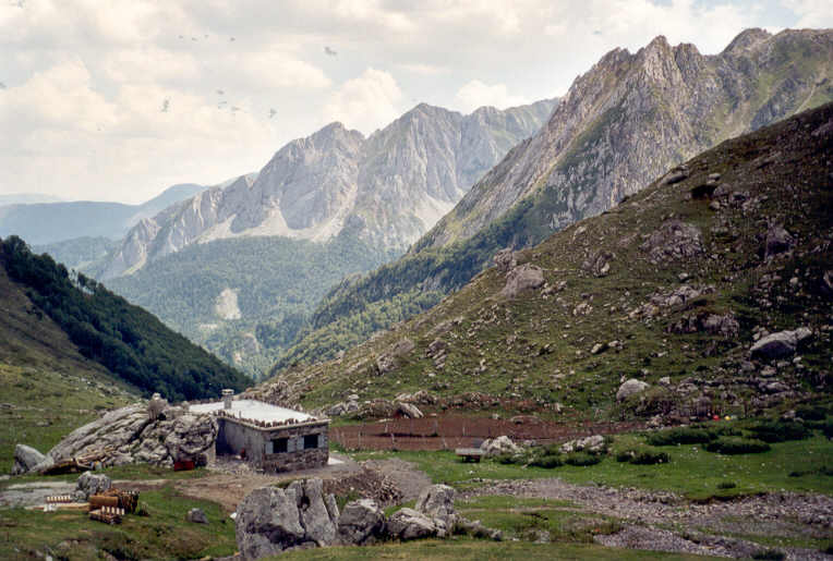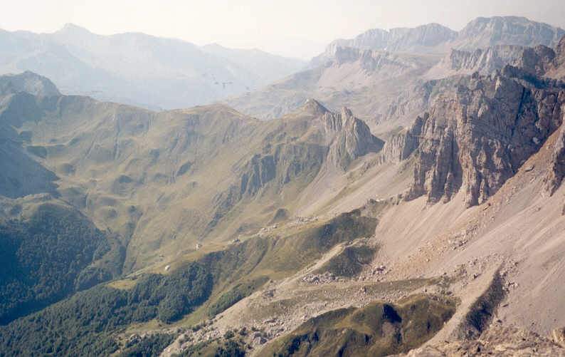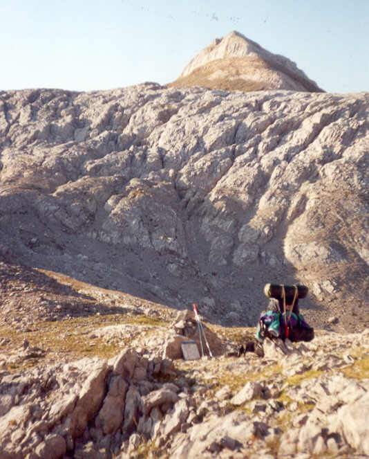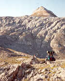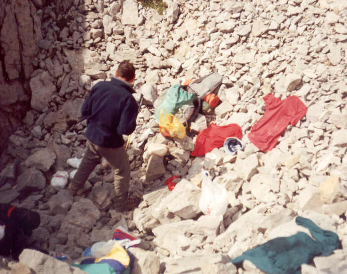 | Après la zone d'éboulis, nous passons près du camp de base d'un club spéléologique de Charente qui "travaille" sur des gouffres frontaliers autour de la Table des Trois Rois. Nous dialoguons un instant avec ceux qui sont là, qui nous offrent gentiment un litre d'eau.