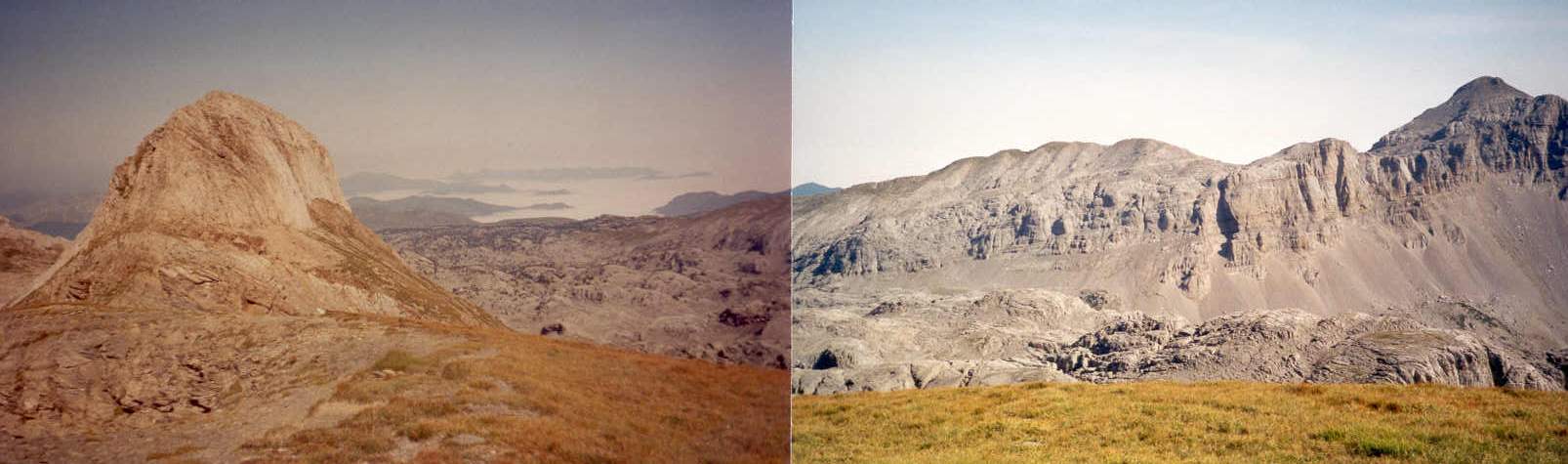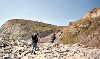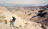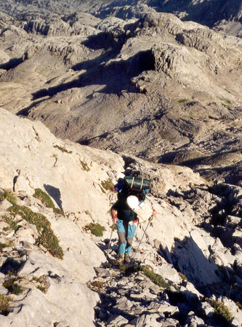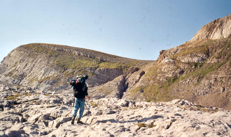 Un important lapiaz nous sépare du couloir qui mène aux deux sommets. L'itinéraire, qui emprunte les crêtes, ne présente pas de difficulté réelle. Nous allons évoluer sur des dalles inclinées nécessitant parfois l'usage des mains. Le calcaire très érodé offre une excellente adhérence. Il n'y a plus de sentier, mais les cairns bien disposés sécurisent la progression.