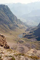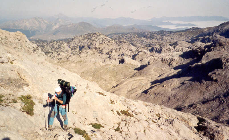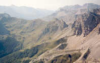 | Pour grimper le dernier dénivelé de 300 mètres, Philippe avouera avoir souffert de la chaleur et de la fatigue. Quand il s'arrête, il se retourne pour admirer encore et toujours les Aiguilles (à gauche sur la photo), le Col d'Escoueste (au centre), le Pic et la Table des Trois Rois (à droite).