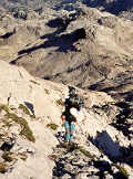 Du Col d'Esqueste, un sentier bien marqué descend dans un pierrier très raide. Grillés par le soleil, nous cherchons de l'ombre pour la pause repas. Bien inconfortable, la seule que nous trouvions est le fond d'une cuvette dans le pierrier. Très vite, nous devons revêtir quelque habit chaud, car un courant d'air frais remonte des profondeurs de la terre.