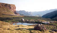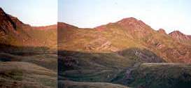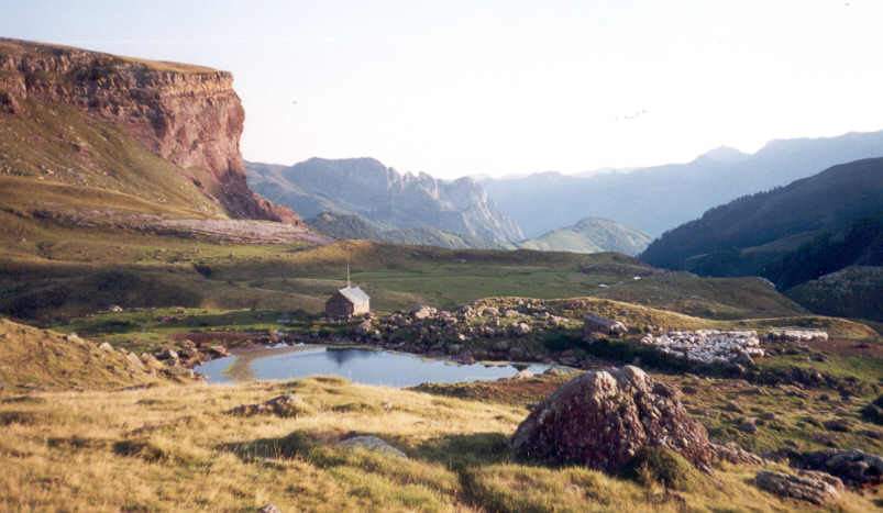 | Pas de tente à démonter ce matin. À 7h30, nous sommes les premiers à quitter le refuge. Au bout de 20 mn, nous prenons le temps de regarder derrière nous. Blotti sous le Pic d'Aillary toujours aussi coloré de rouge, le refuge reçoit les premiers rayons de soleil.