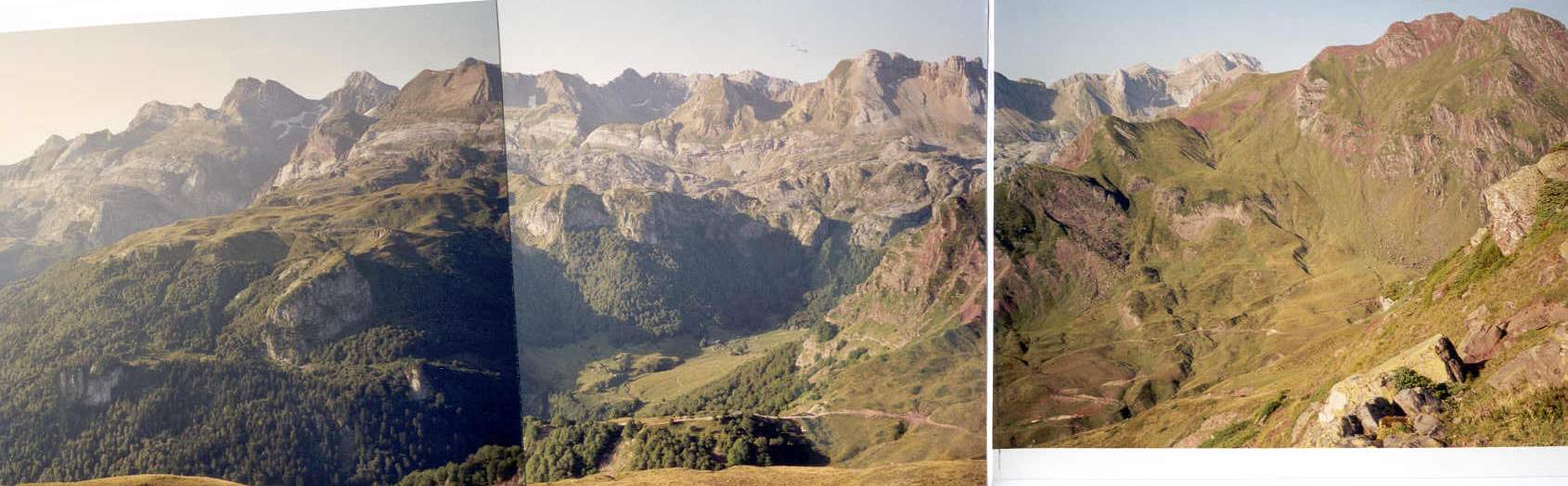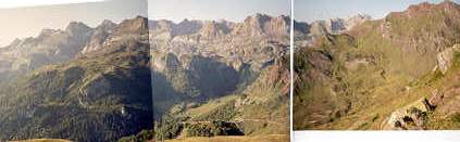 Au Col de Lapachoua, vue panoramique sur le Cirque d'Espélunguère, avec le Pic de Gabetaille (2250m) à droite. Les couleurs sont très différenciées : devant nous, les montagnes sont blanches, à droite, elles sont rouges. Nous allons descendre de 500 m, en passant sur la droite à la Cabane Grosse, en prolongeant jusqu'au Pla d'Espélunguère au centre de la photo. Ensuite, nous traverserons la forêt vers la gauche, en direction de la route RN134.