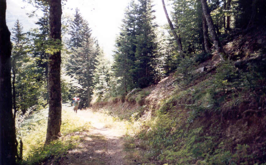L'agréable sentier, qui descend en lacets au parking de Sansanet, fait penser à ceux du Pays basque. De nombreux randonneurs utilisent ce chemin pour atteindre le lac d'Estaëns en Espagne. Nous décidons de déjeuner en forêt pour éviter la cohabitation avec les voitures.