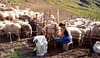 | Une jeune femme, assise et occupée à traire, accepte que nous la prenions en photo et elle répond aimablement à nos questions de curieux.