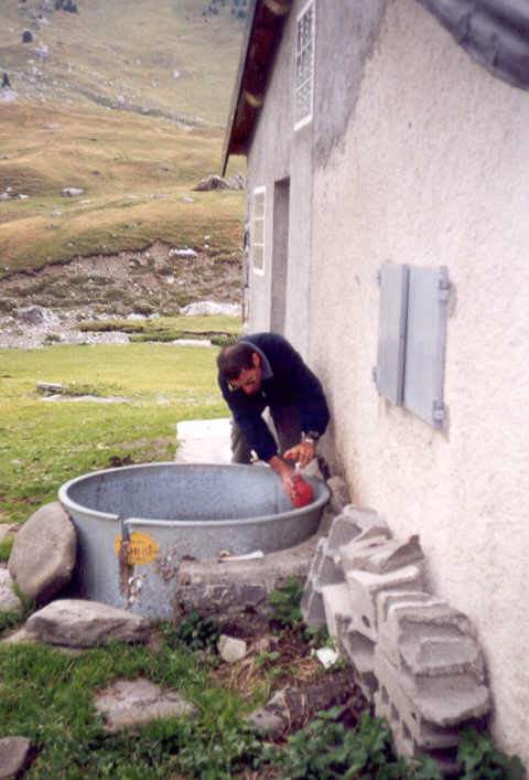 16h. Le ciel s'obscurcit de plus en plus, annonçant l'orage. Vers la Cabane d'Arrius, nous effectuons une pause, et au bout de 5mn, nos yeux se portent sur des jets d'eau irréguliers qui sortent d'un tuyau. Nous descendons remplir nos gourdes.