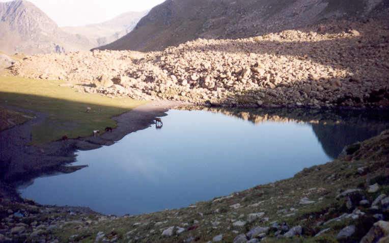 | Sur les rives du lac, nous retrouvons la voie normale de la HRP, en même temps qu'un grand pierrier fatigant où l'on progresse de cairn en cairn si l'on ne veut pas s'égarer. Un petit coup d'œil en arrière pour observer les chevaux qui, les pattes dans l'eau, viennent s'abreuver dans le lac.