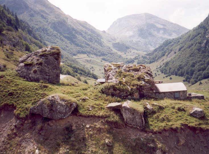 La Cabane de Soques adossée à son "caillou". Au-delà, la route du Col du Pourtalet.
