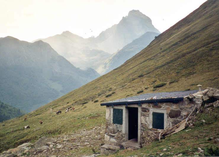 La cabane d'Arrius (1775m). Au fond, le Pic Peyreget et le Pic du Midi d'Ossau.