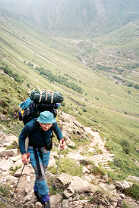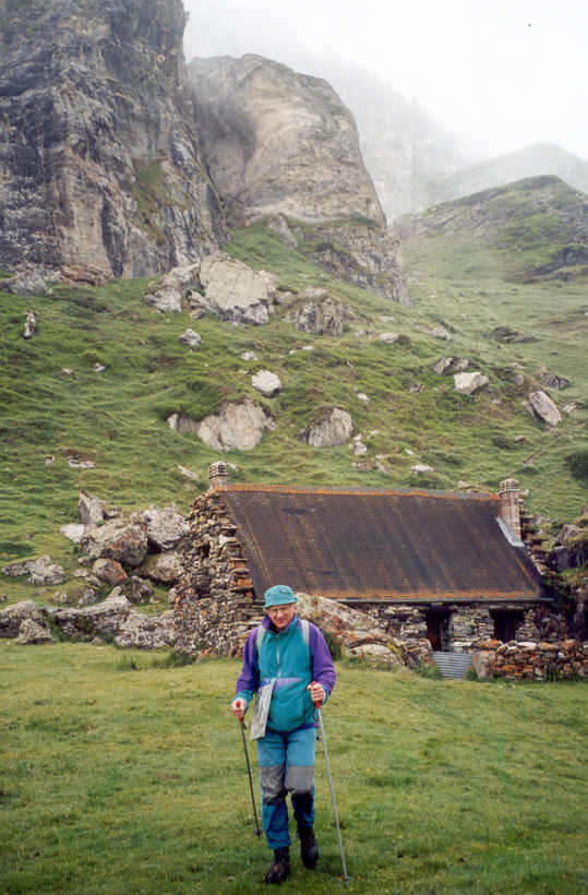 Vers 1700 m, la piste devient sentier quasi horizontal. L'herbe abondante étant très mouillée, et les guêtres étant restées dans les gros sacs à dos, les chaussures, les chaussettes et les pieds sont rapidement trempés. Le brouillard est épais. On ne voit plus rien au-delà de 5 m, même les nombreuses cabanes restent invisibles. Le va-et-vient des troupeaux ayant tracé de nombreuses sentes, il devient nécessaire d'utiliser la boussole et l'altimètre. Ce n'est pas cette fois-ci qu'on prendra du retard pour admirer le massif du Vignemale !
