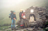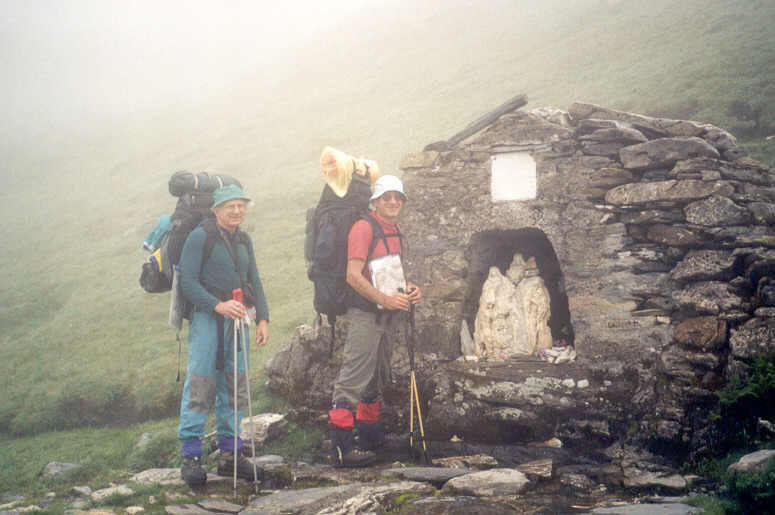 1800 m. Les voici à nouveau dans le brouillard pour le restant du jour. Un randonneur les prend en photo devant l'oratoire de la Sainte-Famille où les personnages semblent avoir été sculptés dans une stalagmite.