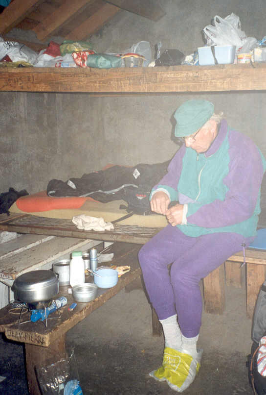 16h50. Entrée dans la cabane, sommaire mais propre. Heureux, Philippe et Yves occupent les lieux, étalent tous leurs effets et font chauffer de l'eau. Quel que soit le temps dehors, la soirée et la nuit promettent d'être bonnes et réparatrices.