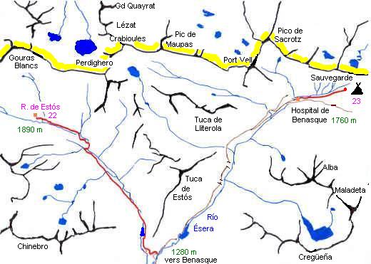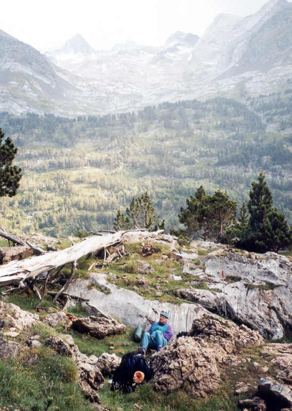 Il reste donc aujourd'hui une longue après-midi de repos devant soi. Yves connaît un chemin, non porté sur les cartes. C'est l'ancien chemin muletier qui grimpe le long de la Pena Blanca en direction du Port de Vénasque. Bien qu'il n'y ait pas de traces tant qu'on reste dans la plaine, on retrouve progressivement celles-ci quand on s'élève vers l'est.