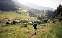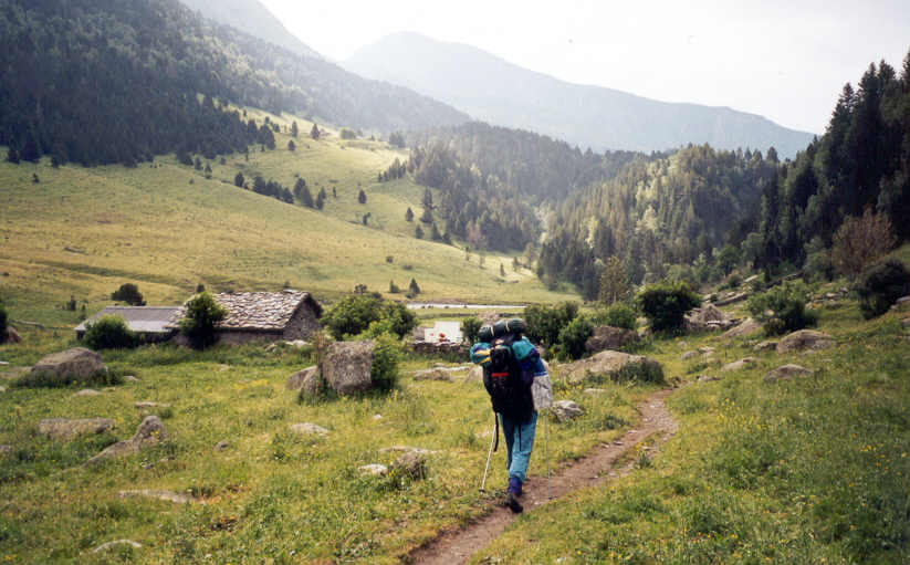 | Descente paisible sur sentier dans un paysage empreint de sérénité. C'est vers la Cabane de Turmo (1750 m) que l'on traverse le rio et que l'on atteint la piste. Ici, lors du passage précédent en 1992, il y avait une multitude de voitures garées. À présent, la piste n'est autorisée qu'au seul véhicule du gardien |