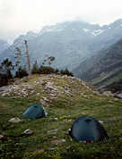 Le soir, sur le coup de 19 h, les tentes sont montées, sur terrain plat mais en plein vent. Le croiriez-vous ? cette ambiance nocturne de solitude ventée a plus de force et d'attraits qu'une nuit en refuge dans un dortoir bondé. |