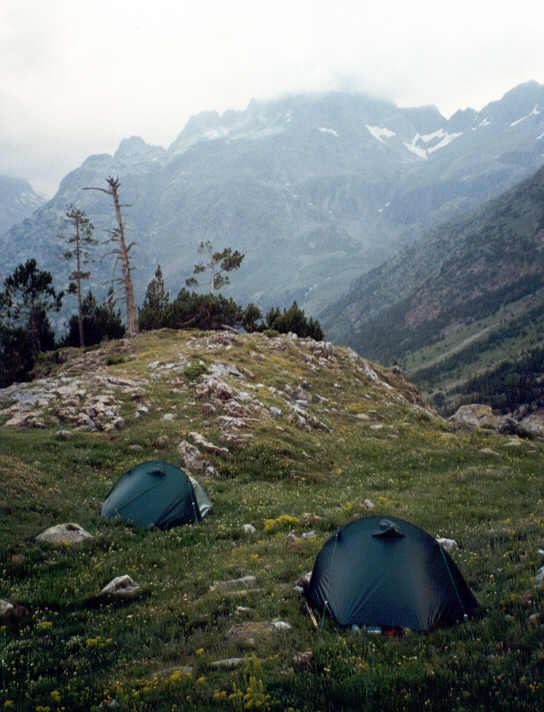 Altitude 2000 m. Les deux hommes cherchent un abri qui soit : à proximité de l'eau, caché des regards de la vallée (car le camping est interdit dans la zone), et protégé du vent qui souffle avec violence. En voulant mettre ses habits à sécher, Yves s'aperçoit que certains d'entre eux sont restés sur la corde à linge du refuge d'Estos. Décidément, ce n'est pas son jour ! |