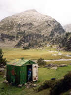Au-dessus du dernier lac (2360 m), un abri métallique rouge est visible de fort loin. Les trois randonneurs de Majorque y ont passé la nuit, et ils ont dit que c'était bien. Mais Philippe et Yves n'ont pas envie de s'arrêter ici ; ils souhaitent descendre encore beaucoup plus bas, à la sortie sud du tunnel de Viella, pour bénéficier du gîte et du couvert à l'Hospital de Viella. Et ce, d'autant plus que les 3 jeunes gens ont dit que la patronne est une excellente cuisinière.