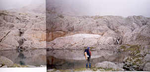 | Du coup, la paysage change. Plusieurs lacs s'étalent dans les creux, le plus caractéristique étant le "lac étranglé", ou "bi-lac" (2320 m). |
