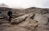 | Les grandes dalles de granit inclinées, polies par les frottements des anciens glaciers, paraissent interminables dans la brume. |