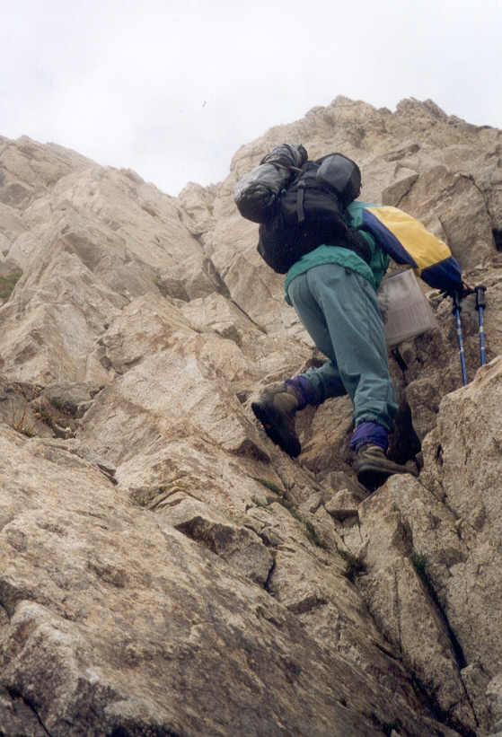 | Le "col" est enfin trouvé. En fait, c'est une simple entaille dans l'arête, et son versant sud est quasiment vertical sur une dizaine de mètres. Cette difficulté se surmonte assez facilement, en technique de désescalade. |
