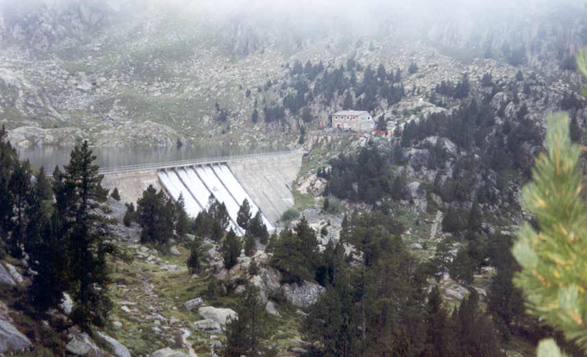 | La marche du jour commence par la traversée du barrage. Ce matin, les eaux coulent abondamment sur le déversoir du trop-plein. Petite montée jusqu'au Collet Cloto (2160 m). Une brume vagabonde cache par moments la vision du paysage, mais chacun sait qu'une brume matinale n'empêche pas le beau temps dans la journée. Donc l'optimisme reste de rigueur.