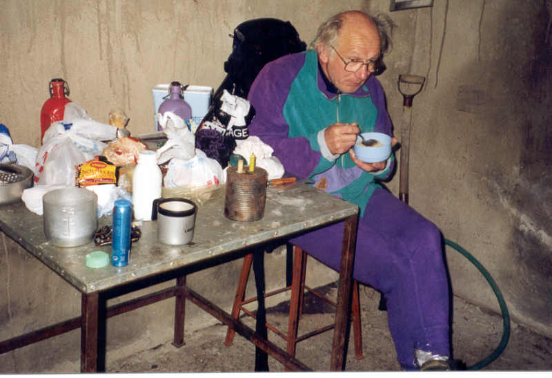 Toujours levés les premiers, Philippe et Yves doivent attendre pour prendre leur petit déjeuner que le réfectoire se libère des dormeurs allongés sur le sol. Ce sont des randonneurs arrivés la veille au soir sans avoir réservé. Et il était trop tard sans doute pour que les gardiens refusent de les héberger.
