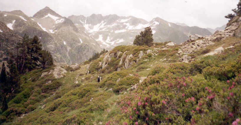 Le sentier - car il y a un sentier - remonte le cours du torrent Riu dels Guerosos. Et le soleil revient alors qu'apparaissent les premiers névés aux Estanys de Gueroso.