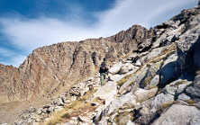 La montée s'est faite versant sud-est, la descente s'effectue versant nord. Ici, le sentier arrive jusqu'au sommet. De nombreux randonneurs de tous âges le suivent. Certains vont vite, et d'autres souffrent. Ils posent immanquablement la question : "Il est encore loin, le sommet ?"