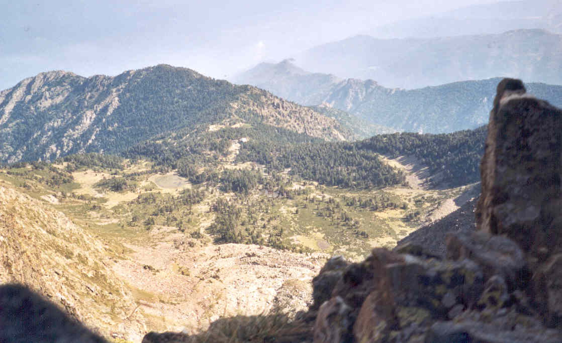 | Yves s'approche d'une petite brèche sur l'arête à droite, et découvre ainsi le plateau où se cache derrière les arbres le Chalet des Cortalets (à gauche de la photo).