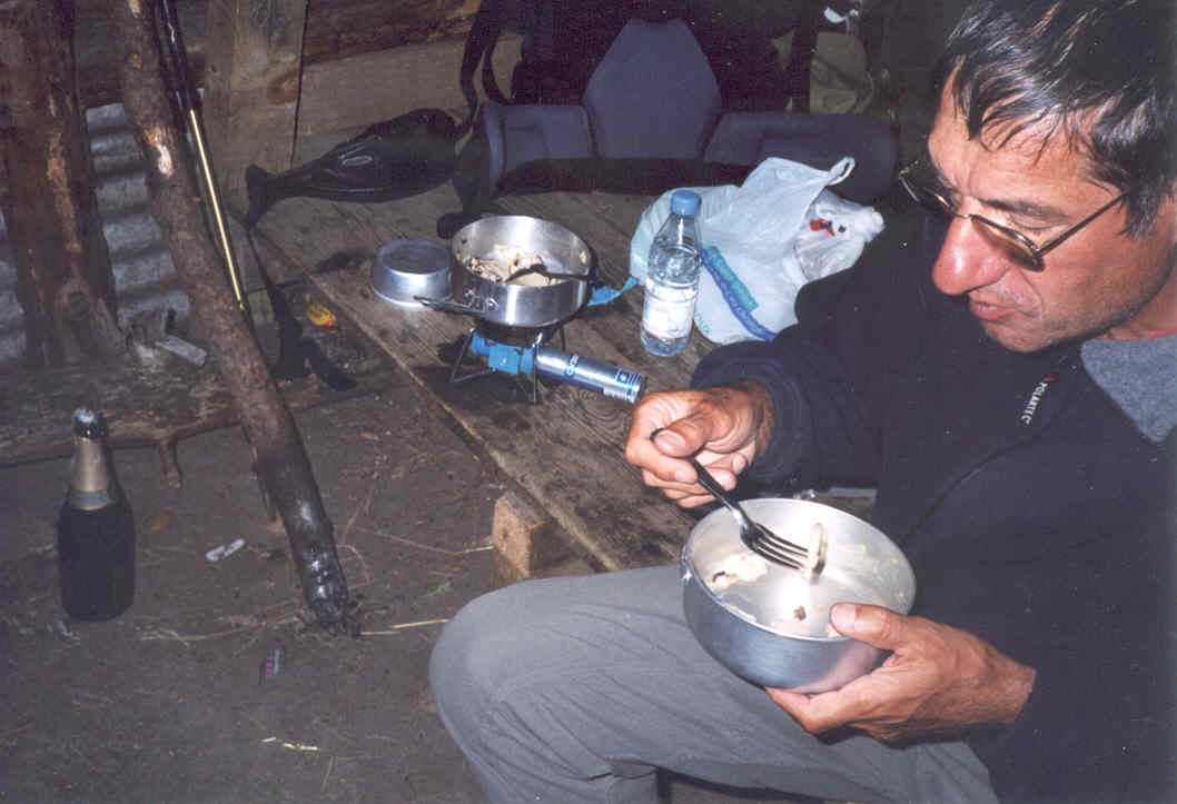 | L'eau la plus proche est à 300 mètres, au torrent. À défaut d'huile, d'ail et de persil, c'est dans cette eau que va mijoter la belle récolte de cèpes. Malgré l'extrême simplicité de la recette culinaire, soyez persuadé que les trois gourmets se sont régalés.
