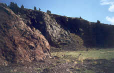 Déjà, lors de la montée vers le col, apparaissaient parmi les arbres de grands bâtiments abandonnés. Et sitôt le col franchi, on se trouve au milieu des mines : galeries où s'abritent les moutons, plates-formes, remblais, débris divers.