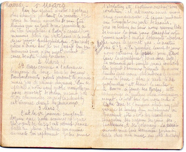 Le matin vers 5 h 30, à la première lueur du jour, nous creusons la fosse, puis a lieu la sépulture (dans une bière). La cérémonie est simple, mais touchante : un piquet d'honneur présente les armes, tandis que nous descendons le cercueil dans la fosse. Alors je récite le "De profundis" et bénis la tombe. A 200 m à peine des Boches, cette cérémonie a quelque chose d'impressionnant. Le petit bois qui nous cache à la vue de l'ennemi abrite un petit groupe de tombes bien entretenues où dorment côte à côte des tirailleurs sénégalais, des sapeurs du génie, des fantassins et des coloniaux.