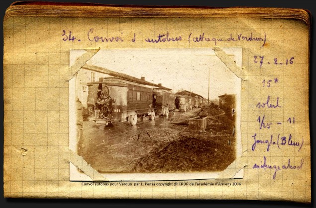 On laisse le sac ici, malgré cela on est fort chargé. En route à 20 h 30. Première pause dans Verdun même. Les marmites éclatent tout près de nous. On traverse une rue qui est une véritable ruine : plus rien ne reste d’une belle file de grandes maisons et de grands magasins, c’est fort triste. Entre temps, la nuit arrive. La canonnade est toujours furieuse. Les attelages qui viennent de ravitailler les automobiles font de la vitesse et nous enveloppent dans d’épais nuages de poussière. Pauvres fantassins ! …