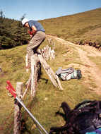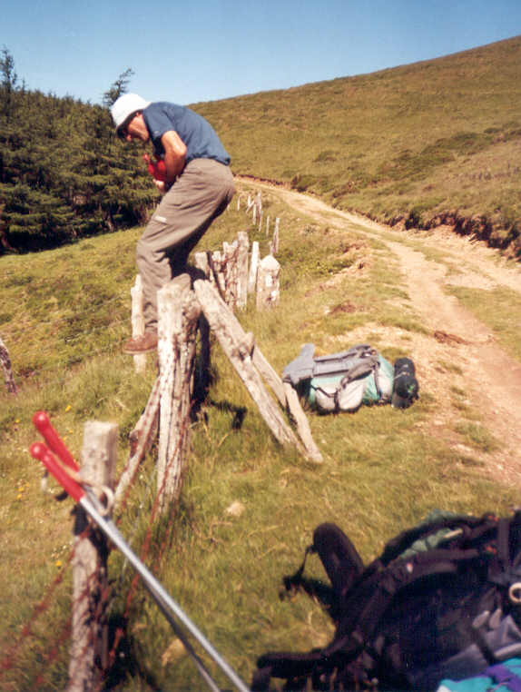 | Ici la frontière est matérialisée par une clôture de fils de fer barbelés, la HRP passant d'un côté, le GR11 de l'autre. Côté navarrais, une source est indiquée où nous devons absolument remplir nos gourdes. Mais la source est captée et bétonnée. Il nous faut récupérer un mince filet d'eau coulant au milieu de la boue et … des bouses.