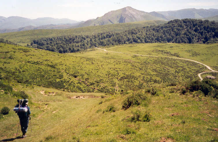 Ce matin, nous allons emprunter à contresens l'ancienne voie des pèlerins de Saint-Jacques-de-Compostelle, et ce, jusqu'à ce que nous ayons regagné la France (depuis hier soir, nous sommes en territoire espagnol car la frontière fait ici une forte avancée vers le nord).