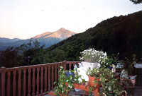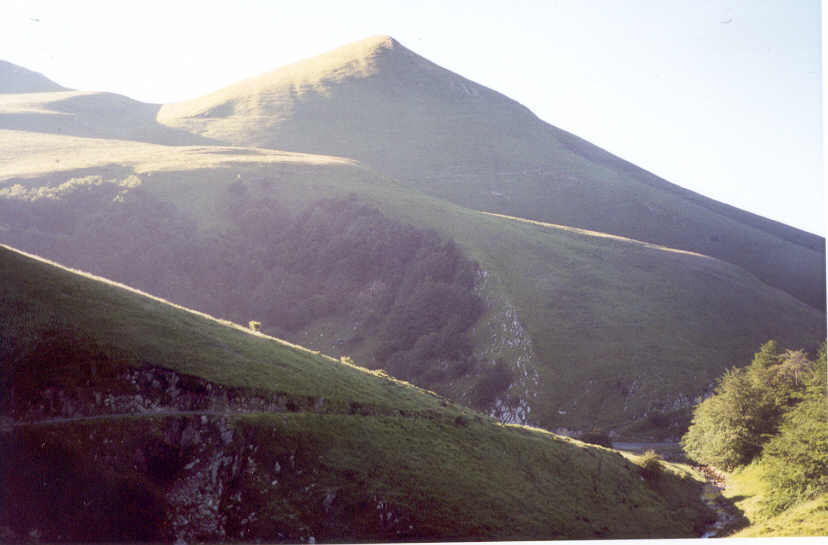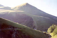 | À la nuit tombante, nous redescendons au centre chercher le téléphone. Quand nous quittons la terrasse du bar, les derniers rayons du soleil éclairent encore le pic d'Orhy, notre destination du lendemain.