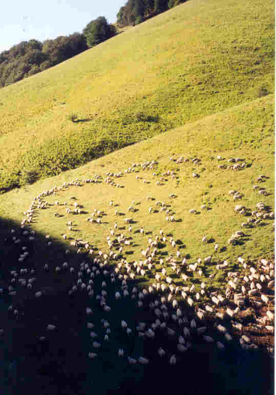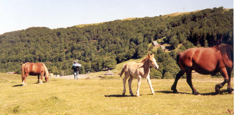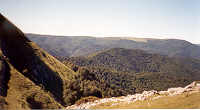 En passant près du col Curutche (1285 m), Philippe a envie d'aller voir ce qu'il y a sur le versant sud : des pentes herbeuses disparaissant dans les épaisses futaies de hêtres. Jusqu'aux crêtes lointaines la forêt épouse les courbes des plissements montagneux, les couvrant d'un vert sombre...