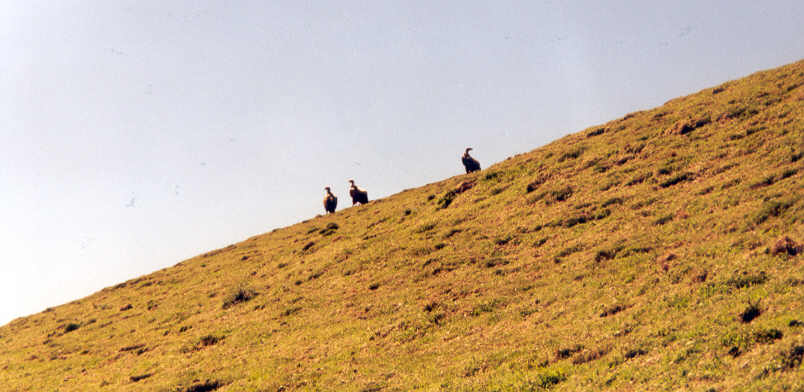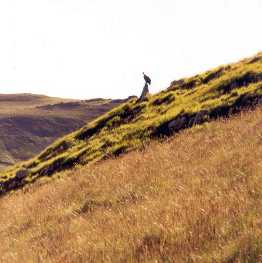 Aux abords de la crête, un vautour qui guette, puis trois autres posés à même le sol, se laissent approcher à quelques dizaines de mètres.