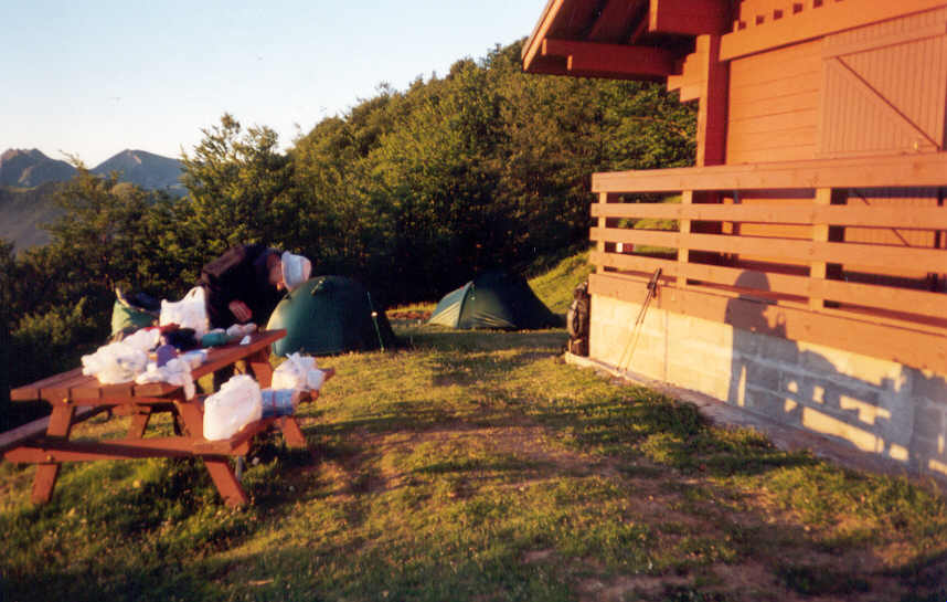 La nuit a été fraîche et humide ; Yves a souffert du froid. Les tentes sont pliées encore trempées, et les sacs sont préparés dans l'herbe humide.