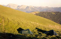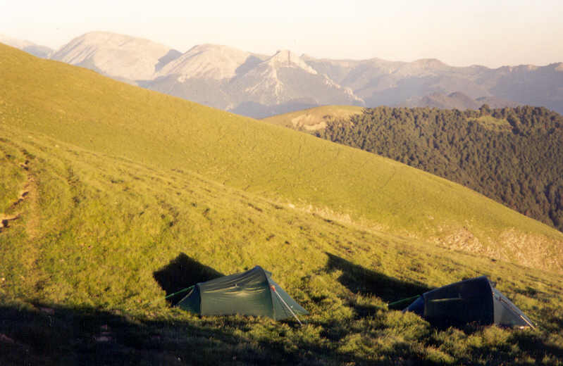 Cette septième journée a été longue : partis à huit heures ce matin, nous arrêtons vers dix sept heures trente pour planter nos tentes juste au-dessous du Col Elhurrosoko (1650 m ), sur le versant espagnol. Sous l'une des toiles de tente, nous prenons notre repas car le vent qui est toujours fort, éteint notre réchaud à gaz.