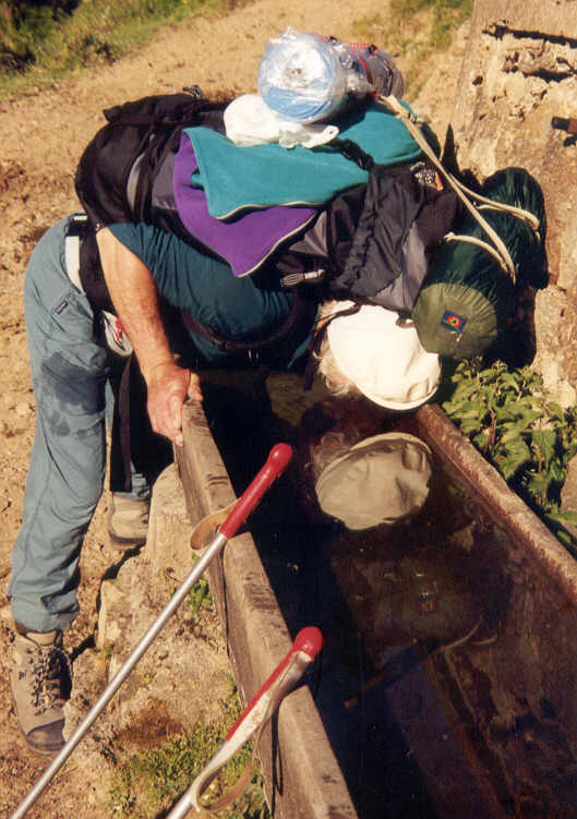 | Au Col Méhatzé, où serpente une petite route, nous nous arrêtons à un abreuvoir alimenté par une source. Nous ne savons pas que ce sera notre dernier point d'eau avant le lendemain à midi.