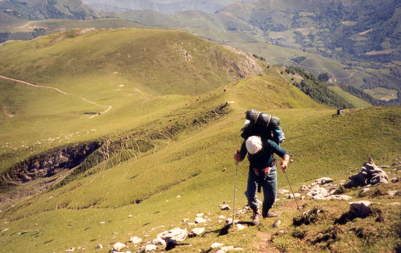 Pour la descente, nous optons pour l'arête sud-est, ce qui demande quelques précautions en raison du cheminement dans les rochers. En approchant du Port de Larrau, nous croisons un groupe de personnes du troisième âge (comme nous, au fait !) qui entame une montée vers le sommet.