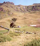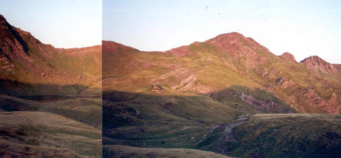 | Pas de tente à démonter ce matin. À 7h30, nous sommes les premiers à quitter le refuge. Au bout de 20 mn, nous prenons le temps de regarder derrière nous. Blotti sous le Pic d'Aillary toujours aussi coloré de rouge, le refuge reçoit les premiers rayons de soleil.