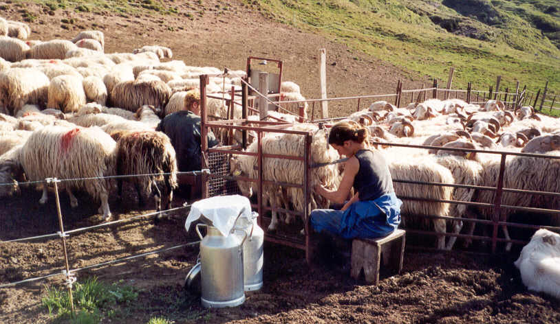 | Une jeune femme, assise et occupée à traire, accepte que nous la prenions en photo et elle répond aimablement à nos questions de curieux.