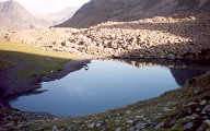 | Sur les rives du lac, nous retrouvons la voie normale de la HRP, en même temps qu'un grand pierrier fatigant où l'on progresse de cairn en cairn si l'on ne veut pas s'égarer. Un petit coup d'œil en arrière pour observer les chevaux qui, les pattes dans l'eau, viennent s'abreuver dans le lac.
