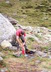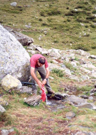 16h. Le ciel s'obscurcit de plus en plus, annonçant l'orage. Vers la Cabane d'Arrius, nous effectuons une pause, et au bout de 5mn, nos yeux se portent sur des jets d'eau irréguliers qui sortent d'un tuyau. Nous descendons remplir nos gourdes.